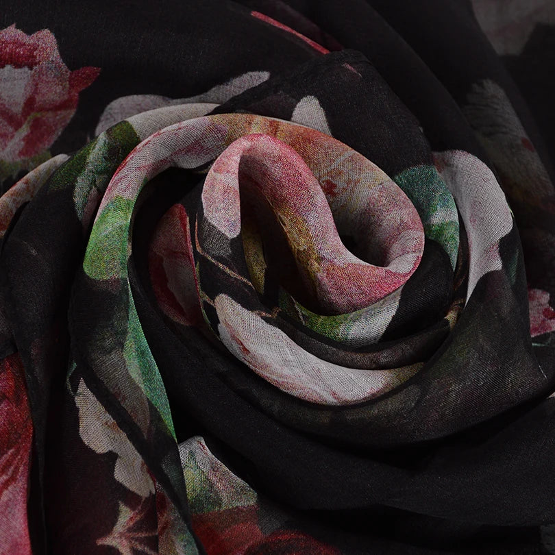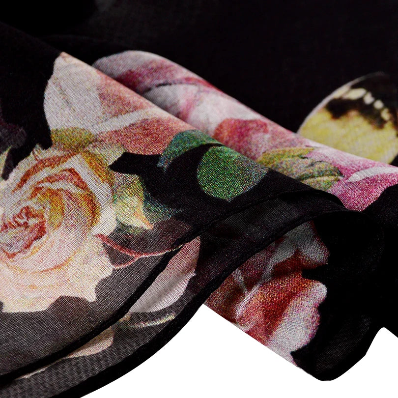 BYSIFA Black Roses Mulberry Silk Chiffon Scarf 180*110cm